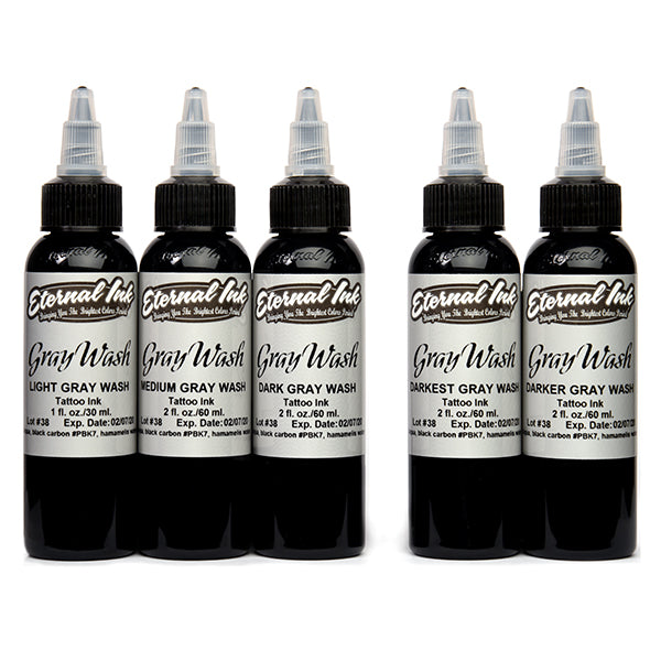 A pre-made 5 range gray wash including light, medium, dark, darker, and darkest shades. Tested by our own world renowned black & gray artists. This set is a must for any black & gray artist, no more wondering how dark or light that new piece is going to heal, with these consistent shades of gray you can't go wrong!!