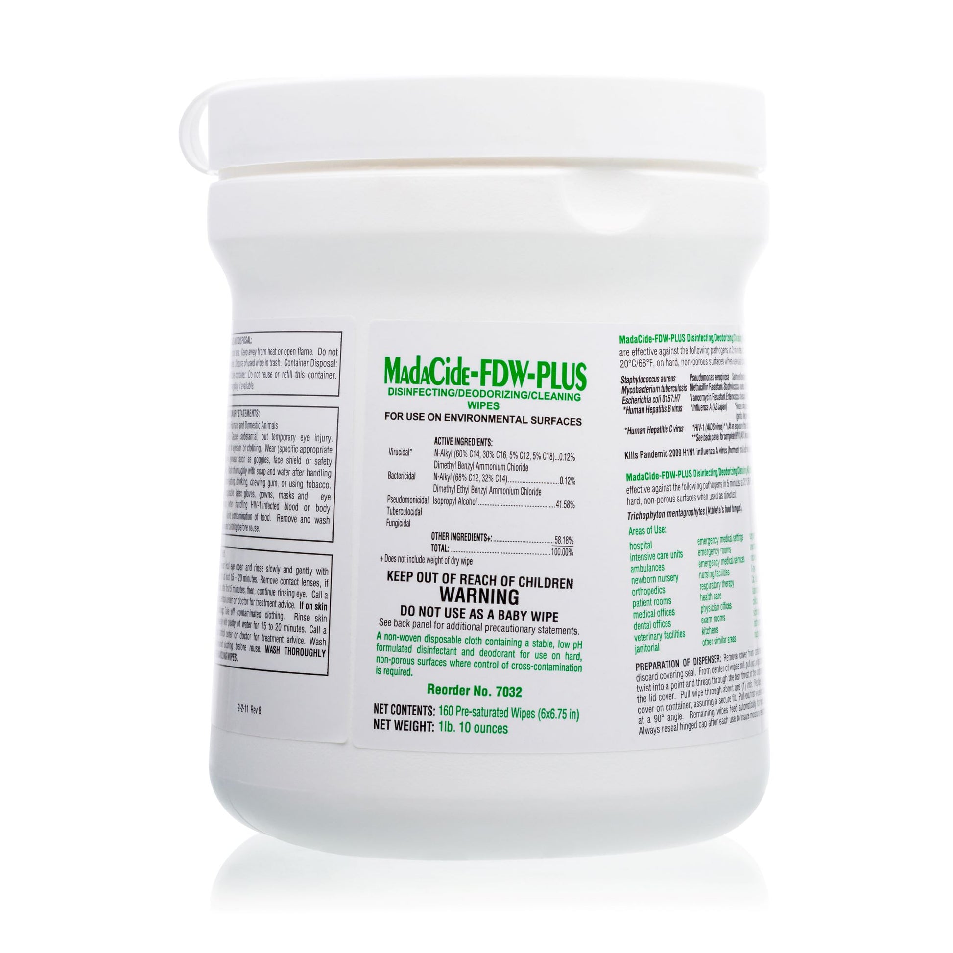 MadaCide-FDW-Plus Wipes is a multi-purpose disinfecting/cleaning/deodorizing wipe for use on hard, non-porous surfaces. Contains durable, nonwoven, nonabrasive wipes for effectively cleaning & disinfecting the infectious surfaces in medical settings. Ideal for use in hospitals, intensive care units, ambulances, dental offices, janitorial, emergency rooms, physician offices and kitchens.
