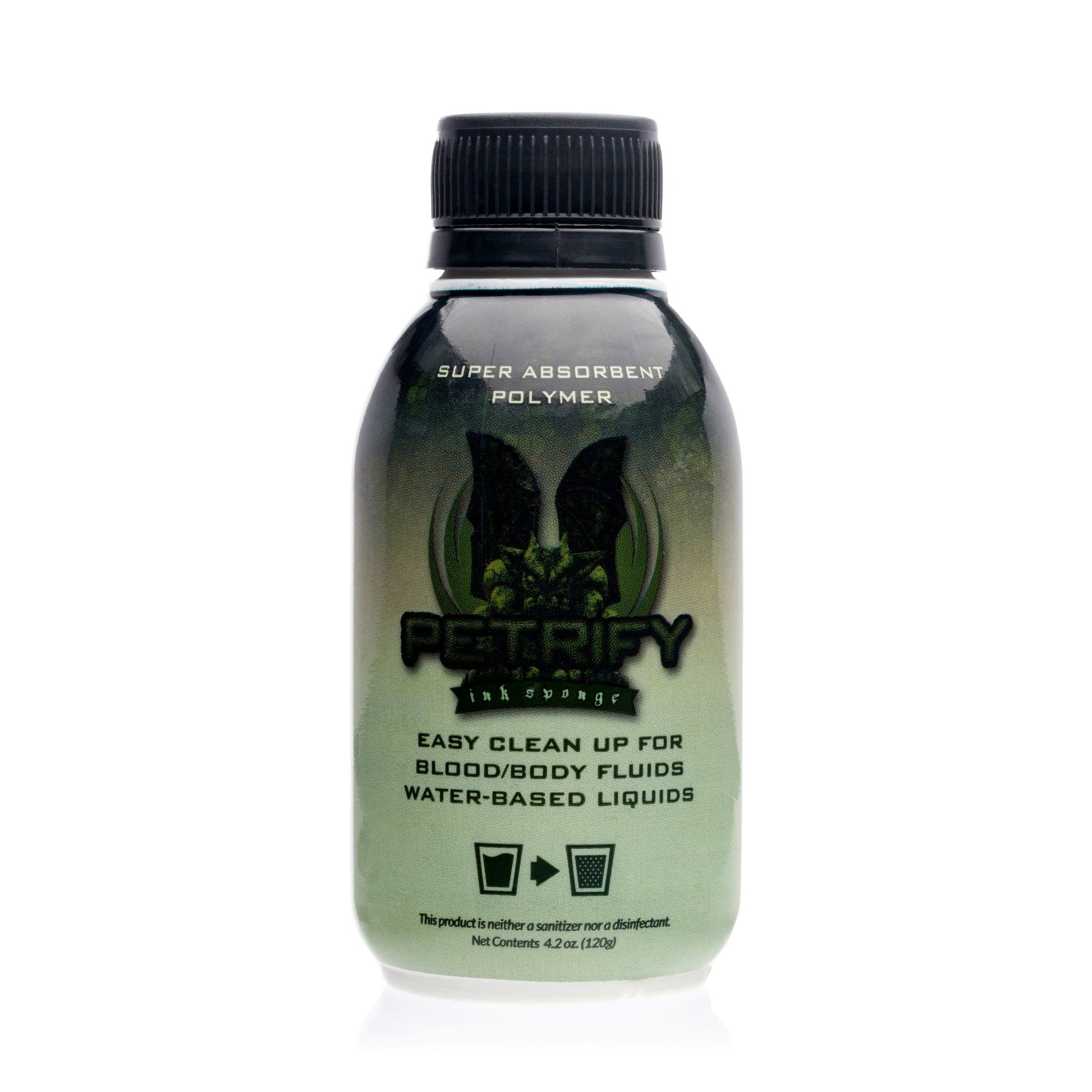 Simplify tattoo studio cleanups with Petrify by Recovery. Designed specifically for tattoo artists, it offers quick and easy disposal of liquids after the tattooing process. With its ability to solidify liquid 30 times its weight in minutes, Petrify is ideal for cleaning up rinse cups without the hassle of spills.