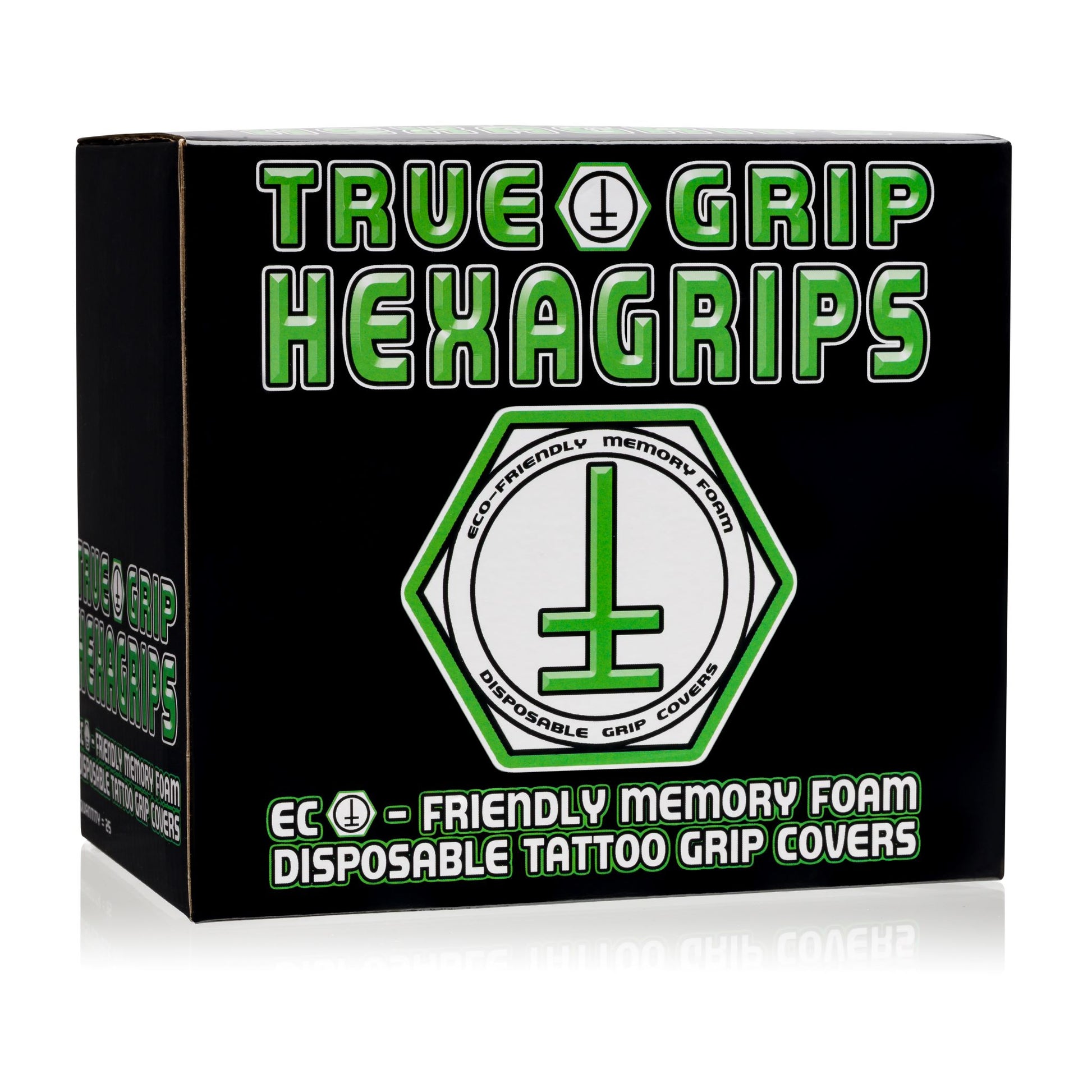 HexaGrips are the world's first angular, dimensional Eco-Friendly, All Disposable, Memory Foam Ergonomic Grip Cover developed by True Tube Tattoo Artists for today's busy tattoo artist. HexaGrips fit the natural angles of an artist's thumb and fingers while tattooing! HexaGrips are the perfect Disposable Grip Cover for today's tattoo artist because they not only provide the artist with a hexagon shaped, angular, softer, larger diameter grip while tattooing, they also help prevent degenerative issues caused by everyday tattooing. HexaGrips also have a "True Coating" that helps retain the artist's grip with ink, ointments and soaps. HexaGrips have comfortable, soft angles providing maximum comfort while gripping. HexaGrips comfortably widen the artists grip on the tube and minimize damaging vibrations caused by machines and tubes in the tattoo artist's hand. They help prevent carpal tunnel, numbness in the thumb and fingers, unwanted finger calluses and many other issues with hands and fingers caused by every day tattooing with tubes. HexaGrips are an easy solution to get the most comfortable results you are looking for with an incredibly comfortable grip, all while having the luxury of being disposable. PACKAGED 25 GRIPS PER BOX